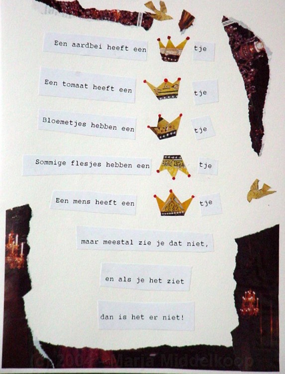 Een aardbei heeft een kroontje Een tomaat heeft een kroontje Bloemetjes hebben een kroontje Sommige flesjes hebben een kroontje Een mens heeft een kroontje maar meestal zie je dat niet, en als je het ziet dan is het er niet! |