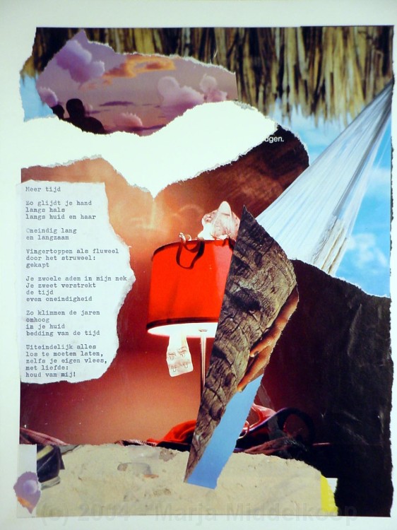 Meer tijd Zo glijdt je hand langs hals langs huid en haar Oneindig lang en langzaam Vingertoppen als fluweel door het struweel: gekapt Je zwoele adem in mijn nek Je zweet verstrekt de tijd even oneindigheid Zo klimmen de jaren omhoog in je huid bedding van de tijd Uiteindelijk alles los te moeten laten, zelfs je eigen vlees, met liefde: houd van mij! |