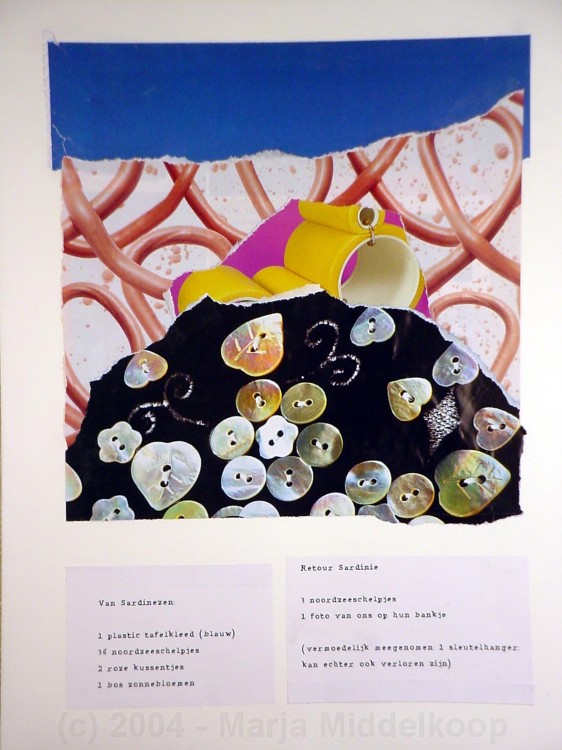 Holiday link: Van de Sardinezen: 1 plastic tafelkleed (blauw) 36 noordzeeschelpjes 2 roze kussentjes (vierkant) 1 bos zonnebloemen. Retour Sardinie (per post): 3 noordzeeschelpjes 1 foto met ons op hun bankje Vermoedelijk meegenomen: 1 sleutelhanger; (kan echter ook verloren zijn; of zoekgeraakt). |